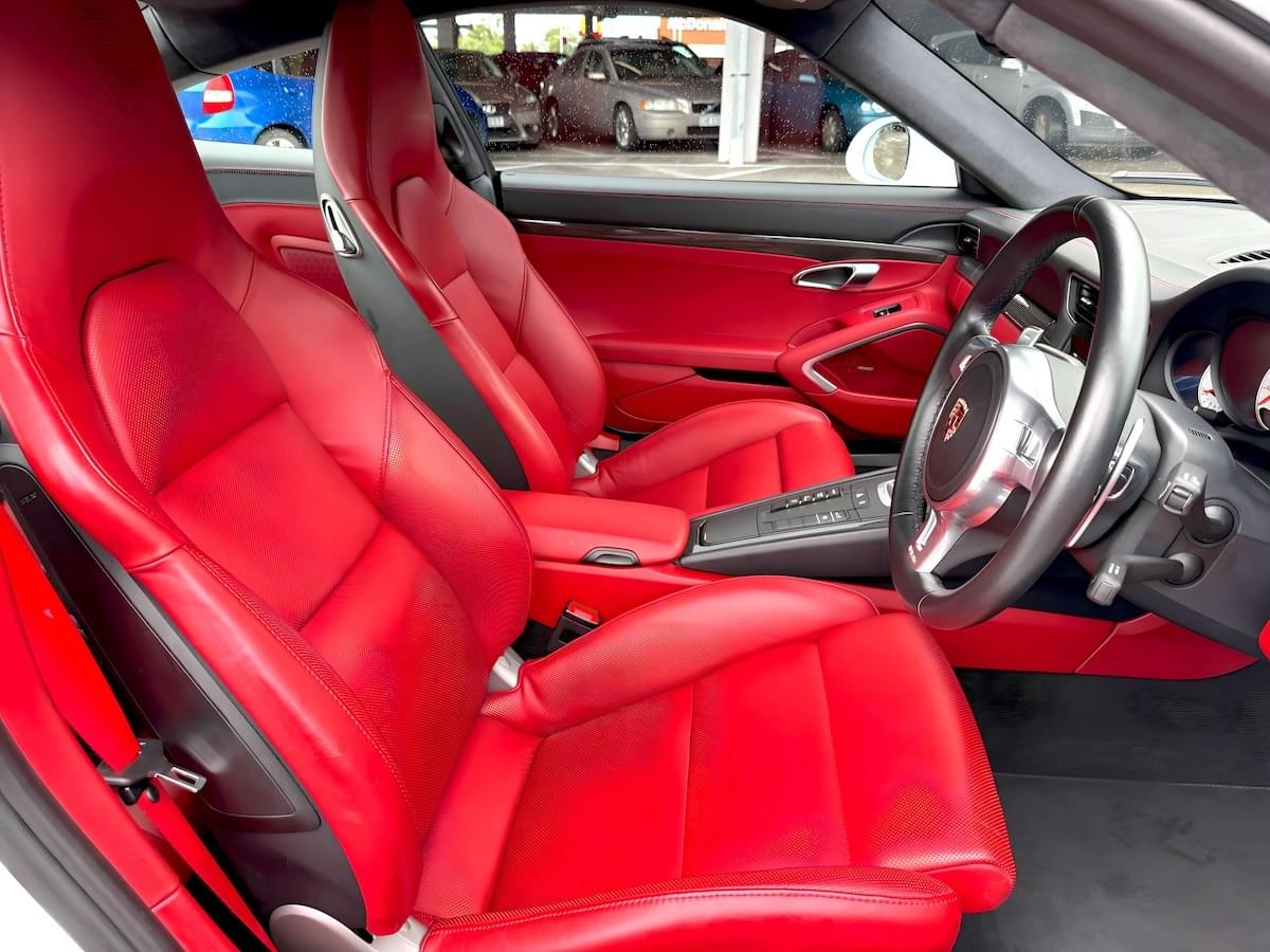 • Carmine Red seat belts & Porsche crests embossed on the headrests – attention to detail